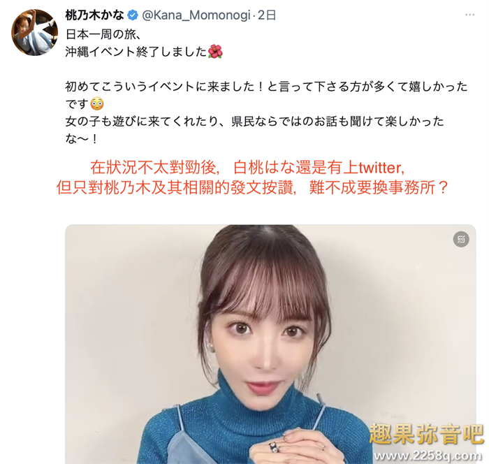 如果是这样子的话,那白桃はな(白桃花)最近两三天在twitter按赞的动作可能就不是她本人所为,因为在出道两周年前她可是个非常热衷于经营社群的女艺人,但最近几乎不发文了: