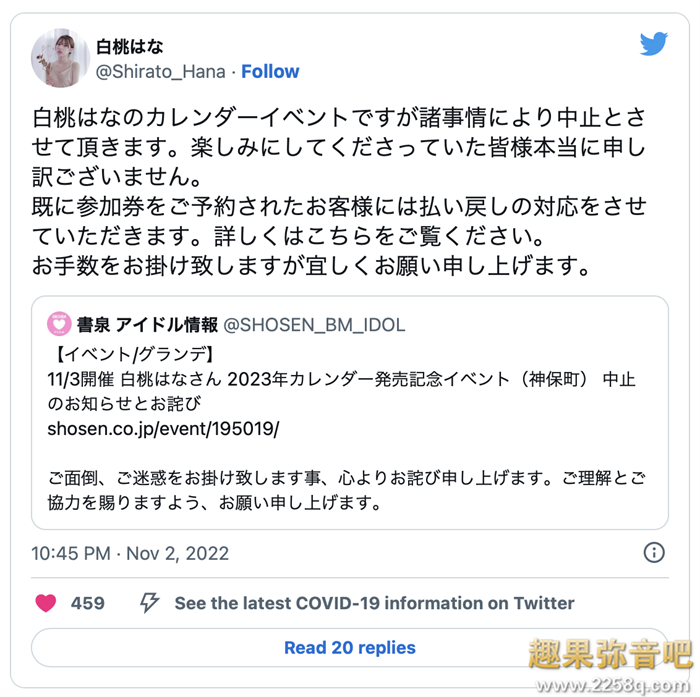 事务所没说太多,但至少在10月初她是没问题的,在确定うんぱい(Unpai)摄影会的时候经纪公司有问谁在海外有机会走红,我那时就有提到白桃はな(白桃花),那时经纪人还说请务必带她去台湾玩,如果那时候就出了问题应该不是这么说吧?