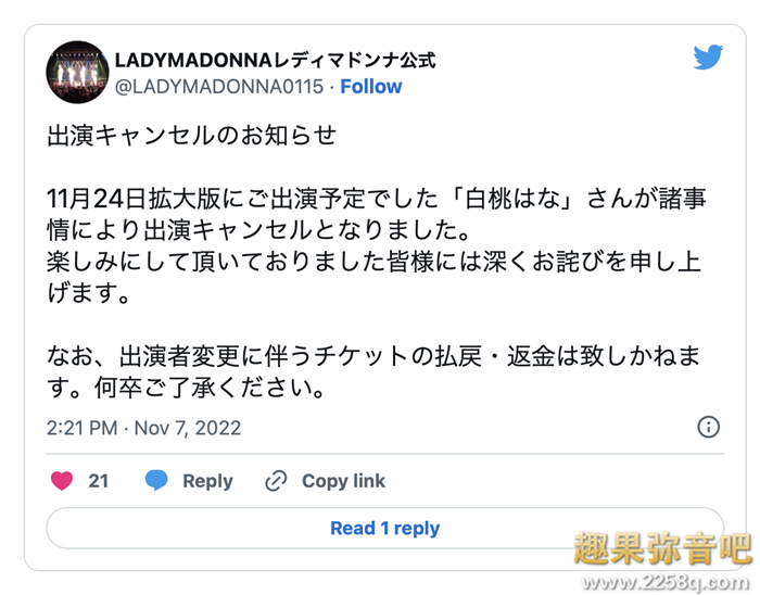 她怎么了呢?首先是活动大量取消,先是11月3日的2023年日历见面会她以因为诸多事情(就是我也不想解释啦)为由缺席活动,虽然有发表道歉声明但之后预定要在11月24日举行的Lady Madonna演唱会她也宣告不出席了,如果是生病那她铁定病得厉害知道两个星期后无法康复,如果不是生病嘛⋯