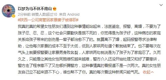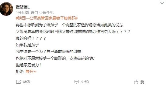 不少网友表示,“家暴只有零次和无数次”,作为受害方,“法医鉴定、报警、离婚,不要为了孩子忍、忍、忍,这个社会只要勤快是饿不死的,你觉得是为孩子好,这种病态的家庭关系给孩子带来的创伤是一辈子都治愈不了的。就算离不了婚,起码报警寻求法律帮助……”“再也不想听到为了给孩子一个完整的家选择隐忍诸如此类的说法”……