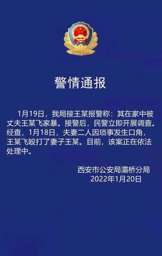 1月20日,西安灞桥警方通过官方微博通报称:“王某飞家暴案”正在依法处理。
