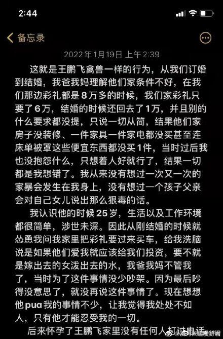 长文写道:“这就是王鹏飞(实施家暴行为男子)禽兽一样的行为,从我们订婚到结婚,我爸妈理解他们家条件不好,在我们那边彩礼都是8万多的时候,我们家彩礼只要了6万,结婚的时候还回去了1万,并且别的什么要求都没提,只说一切从简,结果他们家房子没装修、一件家具一件家电都没买甚至连床单被罩这些便宜东西都没买一件,当时过后我也没抱怨什么,只想着人好就行了,结果一切都是我想错了。我从来没有想过一次又一次的家暴会发生在我身上,没有想过一个孩子父亲会对自己女儿说出那么狠毒的话。”