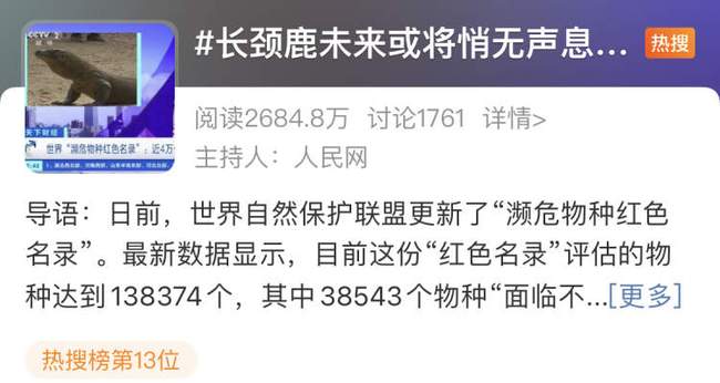 今天一则话题 #长颈鹿未来或将悄无声息灭绝#登上微博热搜,引发网友关注和围观。