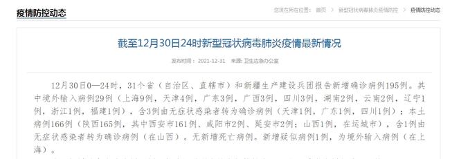 国家卫健委消息,2021年12月30日0—24时,31个省(自治区、直辖市)和新疆生产建设兵团报告新增确诊病例195例。其中境外输入病例29例(上海9例,天津4例,广东3例,广西3例,四川3例,湖南2例,云南2例,辽宁1例,浙江1例,福建1例),含3例由无症状感染者转为确诊病例(天津1例,广东1例,四川1例);