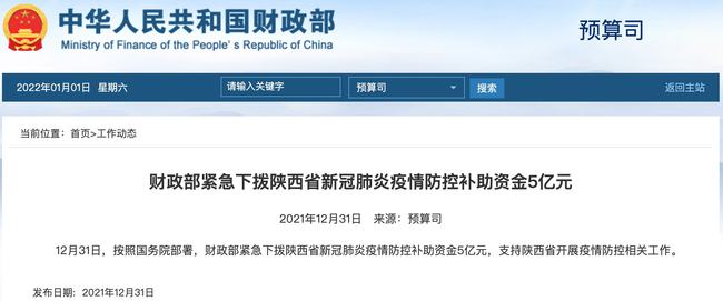 财政部2021年12月31日消息,按照国务院部署,财政部紧急下拨陕西省新冠肺炎疫情防控补助资金5亿元,支持陕西省开展疫情防控相关工作。