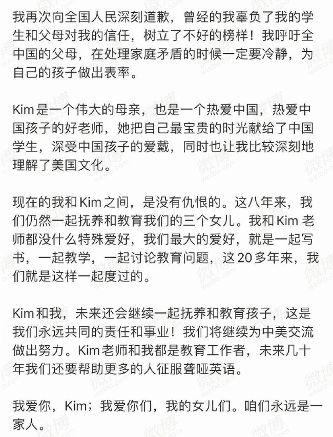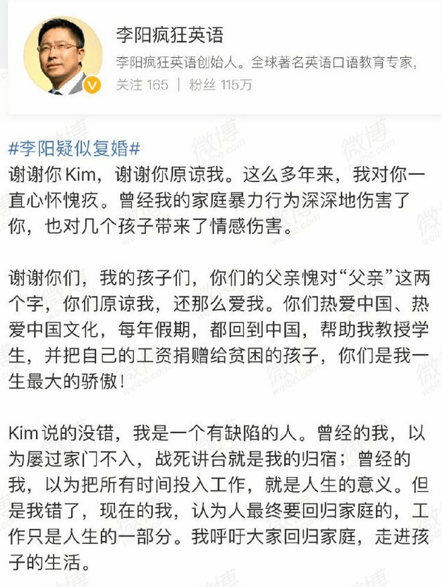 2019年11月28日,李阳前妻kim又在微博上发文声称自己已经原谅了李阳对自己曾经造成的家暴伤害,表示李阳毕竟是三个可爱女儿的父亲,也毕竟曾经爱过自己。同年12月4日,当事人李阳也对前妻kim进行了回应,声称自己特别感谢kim对自己的原谅,也为自己的家暴行为道歉,以后会做一个好父亲,好好爱kim,爱女儿。