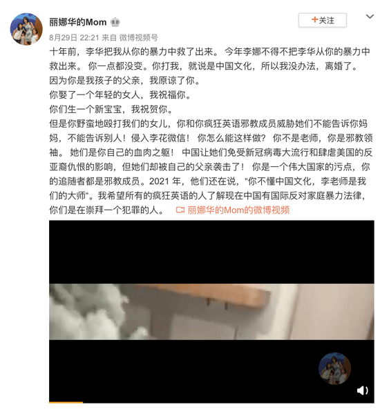 据悉,8月29日晚,疯狂英语李阳前妻Kim晒出疑似李阳家暴女儿的视频,“她们是你自己的血肉之躯! 中国让她们免受新冠病毒大流行和肆虐美国的反亚裔仇恨的影响,但她们却被自己的父亲袭击了!”
