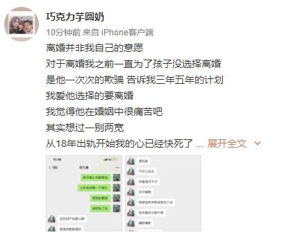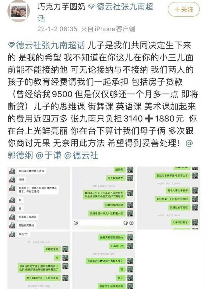 1月2日下午,张九南前妻再发文称:“离婚并非我自己的意愿 ,对于离婚我之前一直为了孩子没选择离婚,是他一次次的欺骗,告诉我三年五年的计划,我爱他选择的要离婚,我觉得他在婚姻中很痛苦吧,其实想过一别两宽,从18年出轨开始我的心已经快死了,离婚的骗局,不知从何时开始策划,但已成事实,只希望他对孩子负起爸爸的责任。”
