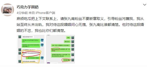 她又发文称:“麻烦吃瓜把上下文联系上,请张九南粉丝不要断章取义,引导粉丝污蔑我,我从始至终从未出轨,我对待这段婚姻问心无愧,张九南比谁都清楚。他对待这段婚姻的不忠,我也比你们都清楚。 ”