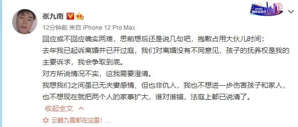 2日下午,张九南发文回应称:“回应或不回应确实两难,思前想后还是说几句吧,抱歉占用大伙儿时间:去年我已起诉离婚并已开过庭,我们对离婚没有不同意见,孩子的抚养权是我的主要诉求,我会争取到底。对方所说情况不实,这我需要澄清。我想我们之间虽已无夫妻感情、但也非仇人,我也不想进一步伤害孩子和家人,也不想现在就把两个人的家事扩大,谁对谁错,法庭上都已说清了。”