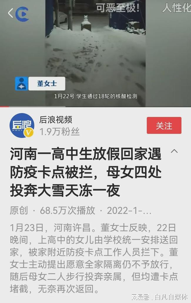 女生回家防疫点被拦 母女雪天站一夜#近日,河南禹州某高中女生进行了18轮核酸阴性检测后,学校表示可以开一个通知,让放假核酸阴性的孩子回家,因为家这边是高危区,卡上写着不能进。让孩子和妈妈去低风险地区投靠亲友,卡点不准通行;母女俩只好在冰冷的雨雪中站了一夜!看到这个事件很难过!抓疫情防控的初衷是什么?不就是为了保护人民的生命健康安全吗?我们没抓到位是因为形式主义,不符合上级要求,更不是因为机械执行规定而抓,以至于母女俩在雪地里站了一夜,万一冻出个好歹来,怎么可能到这里?这不是本末倒置吗?