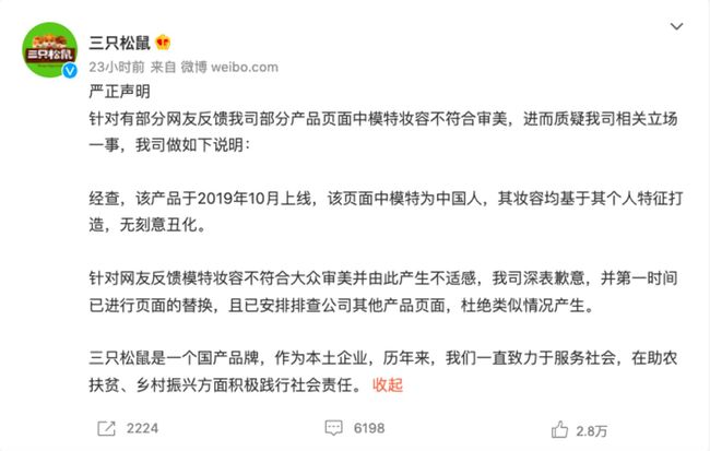 26日,三只松鼠发布致歉声明表示,经查,该产品于2019年10月上线,该页面中模特为中国人,其妆容均基于其个人特征打造,无刻意丑化。对于网友由此产生的不适感,三只松鼠深表歉意,并第一时间已进行页面的替换,且已安排排查公司其他产品页面,杜绝类似情况产生。