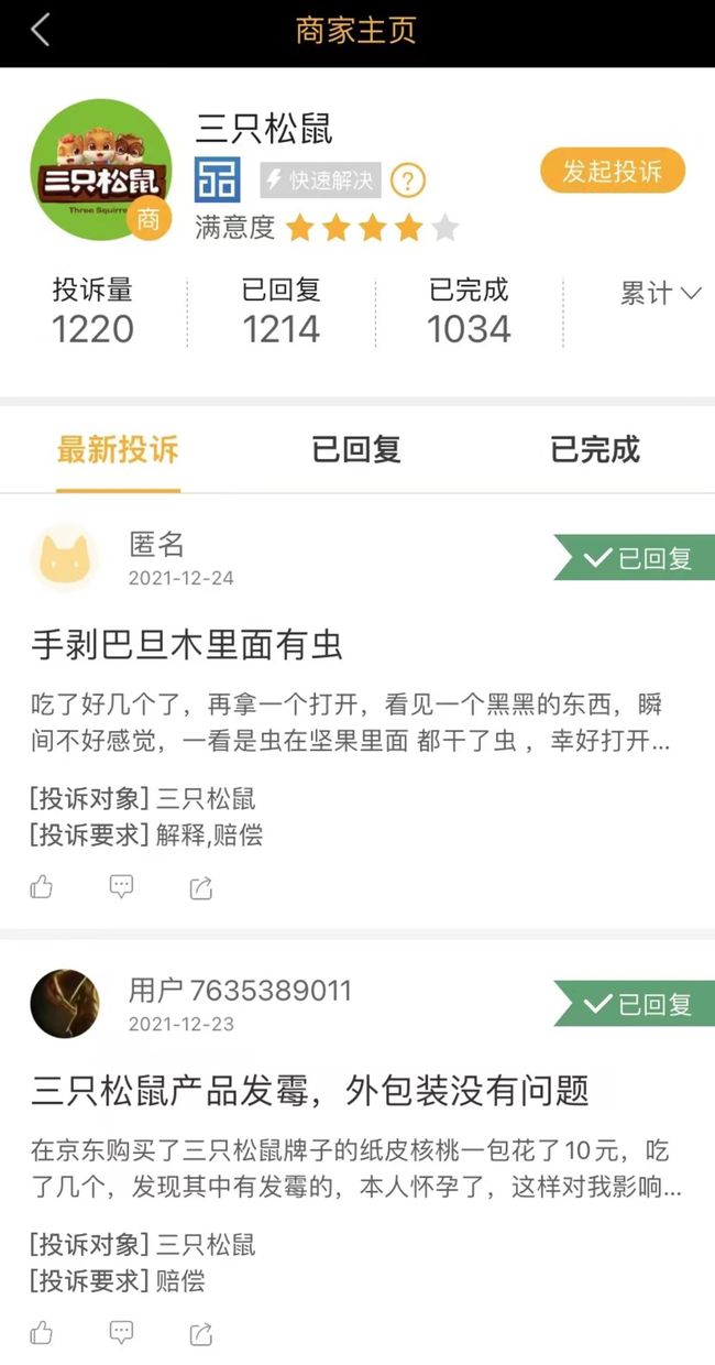 经钛媒体App查询,在黑猫投诉平台上,三只松鼠共收到1220条投诉,其中很大一部分系因零食中被吃出毛发、虫子、毛发、不明物体,甚至蛆虫等产品质量问题,而遭到投诉。