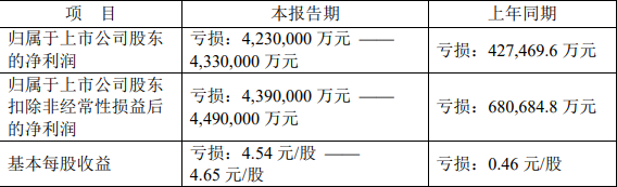 综上,公司预计2021年实现归属于上市公司股东的净利润亏损423亿元—433亿元。