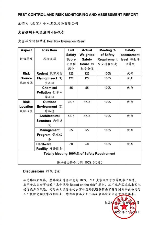 – 为确保产品品质,杜绝潜在问题,小高也开启了自查,委托了国家一级资质的具有害虫生物防治评估服务的专业机构,对工厂进行现场评估。评估得到的结论为“工厂整体安全符合程度为100%,企业所有区域的虫害控制由各部门直接监管,并且由A级资质的虫害管理外包服务商负责。作为非食品企业,已满足食品安全虫害管理的要求。”(报告详见配图)