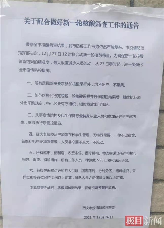 12月27日12时,西安将启动新一轮核酸筛查。官方消息称,为确保新一轮核酸筛查结果的精准度,从27日零时起,强化防控措施。要求所有居民除按要求参加核酸采样外,均不出户、不聚集。