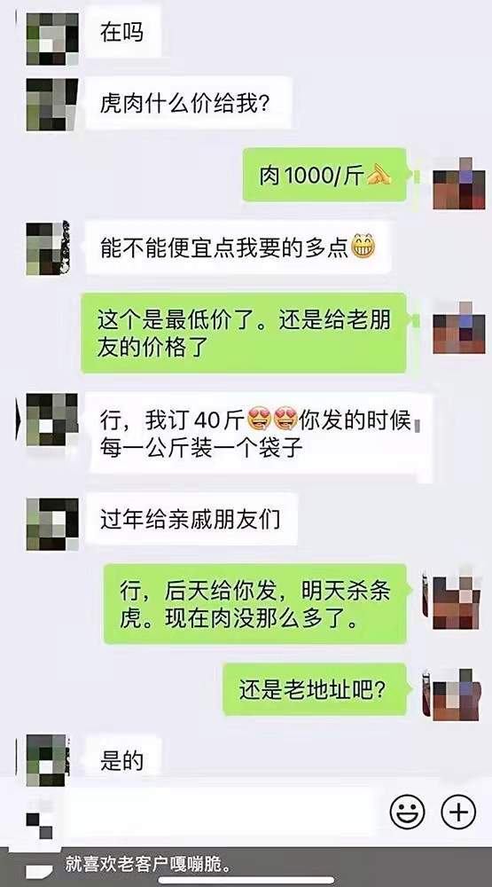 近日,有网友爆料称,一位段姓男子疑似在网络上销售虎肉、虎骨、虎皮、及金钱豹肉、皮、麝香等制品。此人在网上展示了相关照片,还有虎肉售卖交易聊天截图。在聊天中,买家询问虎肉价格,此人回应称给老朋友的价格是 1000/ 斤。该买家随后订购了 40 斤,并支付了 40000 元。经查:段某(男,汉族,现年 43 岁,现居住沁阳,无业)以网购的人工饲养鹿肉冒充虎肉,以 ps 的狗皮图片冒充虎皮,下载网上图片、捏造聊天记录发布虚假信息,欲从中牟取暴利。截至案发,尚无人上当。目前,沁阳市公安局以涉嫌非法利用信息网络罪对段某立案调查,案件正在进一步办理中。(来源:河南大小事儿)