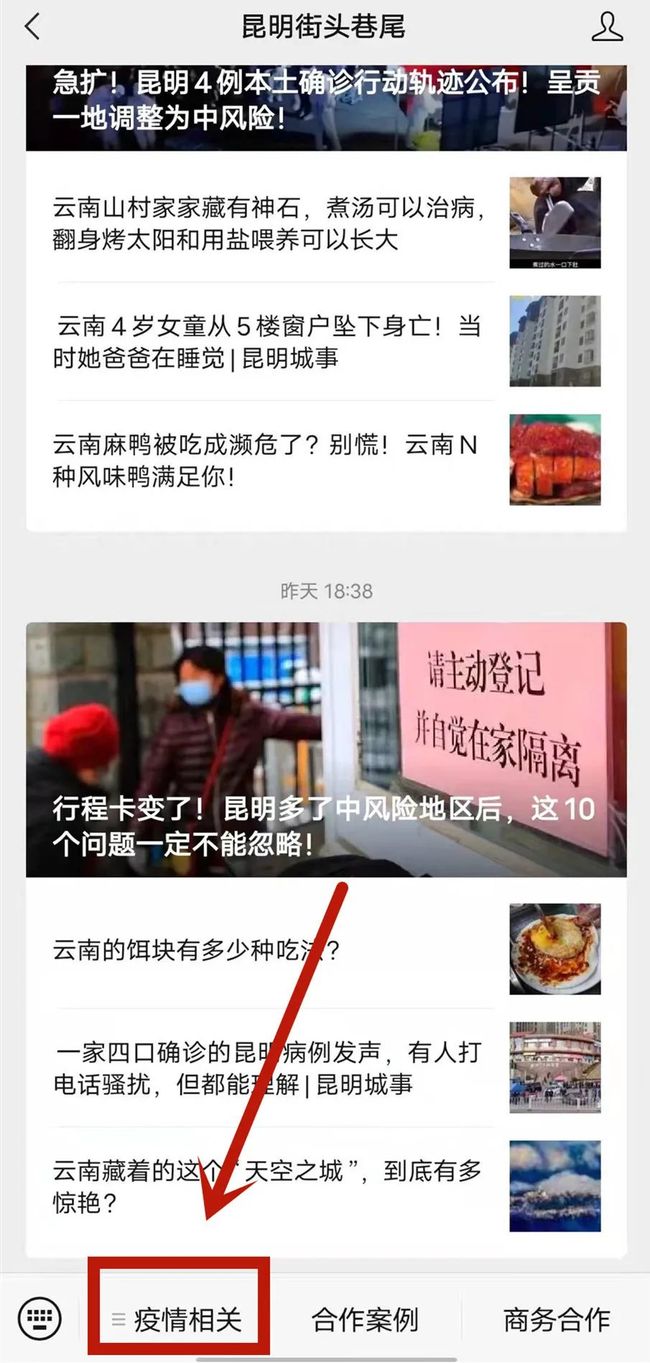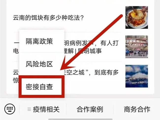 大家点进公众号后台,找到“疫情相关”栏中的“密接自查”,就行。