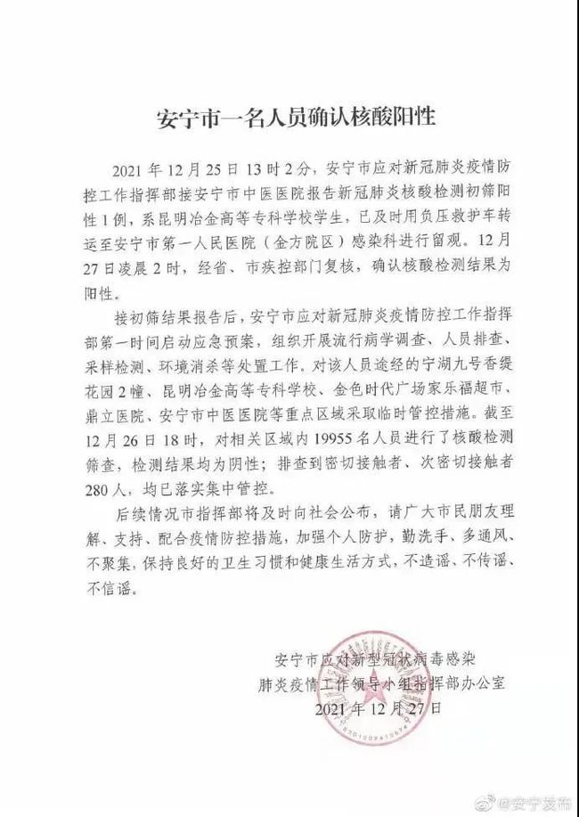 12月25日13时2分,安宁市中医医院报告新冠肺炎核酸检测初筛阳性1例。系昆明冶金高等专科学校学生,后转运到安宁市第一人民医院进行留观。