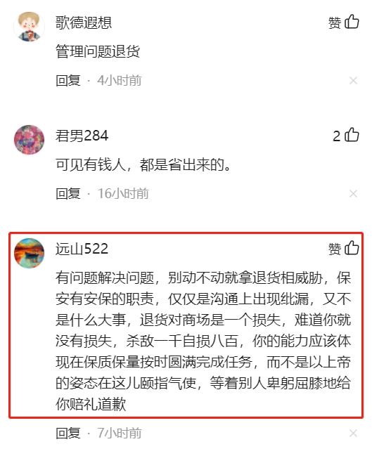 网友评论,远山522:有问题解决问题,别动不动就拿退货相威胁,保安有安保的职责,仅仅是沟通上出现纰漏,又不是什么大事,退货对商场是一个损失,难道你就没有损失,杀敌一千自损八百,你的能力应该体现在保质保量按时圆满完成任务,而不是以上帝的姿态在这儿颐指气使,等着别人卑躬屈膝地给你赔礼道歉