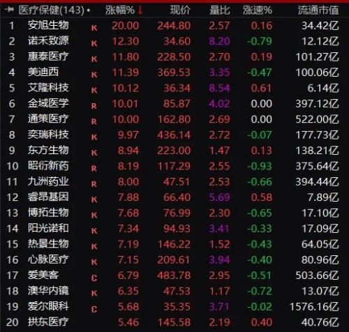 医疗保健板块,诚达药业20%涨停,诺禾致源、惠泰医疗、美迪西等纷纷大涨。牙茅通策医疗涨停,检测股龙头金域医学也涨停。