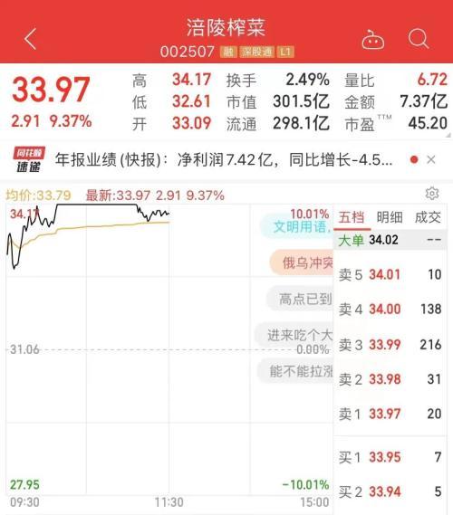 300亿市值的消费股榨菜茅涪陵榨菜,盘中封涨停,收涨逾9%。