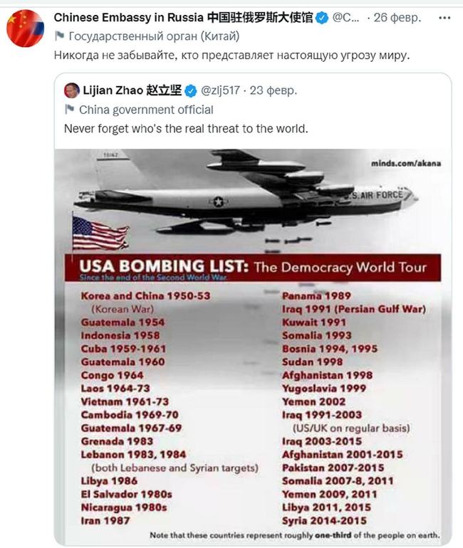 赵立坚发布了一张带有标题为“美国轰炸清单:世界民主之旅”图片的推文。中国驻俄罗斯大使馆则针对他的这则推文称,美国是世界的真正威胁。