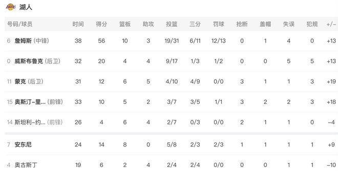 湖人:詹姆斯56分10篮板3助攻,蒙克12分6篮板5助攻4抢断,威少20分4篮板4助攻,安东尼14分8篮板,里夫斯10分。