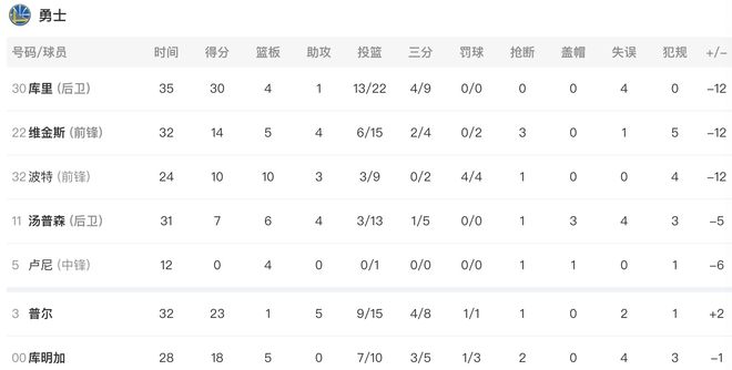勇士:库里30分,维金斯14分5篮板4助攻3抢断,波特10分10篮板,克莱7分6篮板4助攻,普尔23分5助攻,库明加18分。