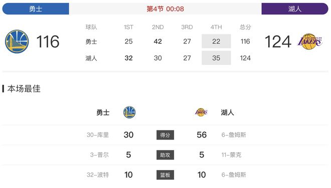 末节威少上篮得手,库明加命中三分,詹姆斯连续三次三分命中,普尔打成2+1,詹姆斯上篮打进,库里进攻得分,奥古斯丁命中三分球,库明加回敬三分,两队战成105平。随后里夫斯命中三分,库里回敬三分球,约翰逊补篮得手,库里上篮打进,詹姆斯罚球命中,库明加补扣打进,安东尼打成2+1,蒙克命中三分,詹姆斯暴扣打进,湖人领先7分。之后库里进攻得分,詹姆斯助攻安东尼命中三分,湖人锁定胜利。