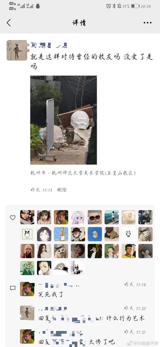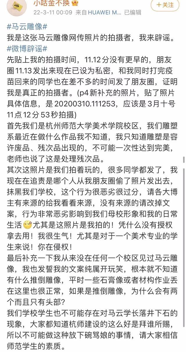 11日,#拍摄者辟谣杭师大马云雕像被拆#,表示被遗弃的雕像是学生遗留的残次品模具,是因为学校雕塑工作室在进行消防检查才被处理。
