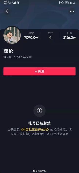 3月15日,邓伦抖音账号显示已被封禁。【编辑:程春雨】