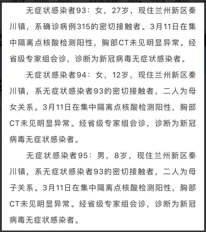 流调显示,一名居住在兰州新区秦川镇的母亲和她的一对儿女均为无症状感染者,母亲年龄为27岁,女儿年龄12岁,儿子年龄8岁。
