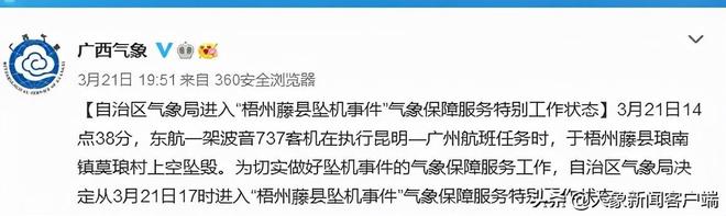 据广西壮族自治区气象局官方微博消息,3月21日14点38分,东航一架波音737客机在执行昆明—广州航班任务时,于梧州藤县琅南镇莫琅村上空坠毁。