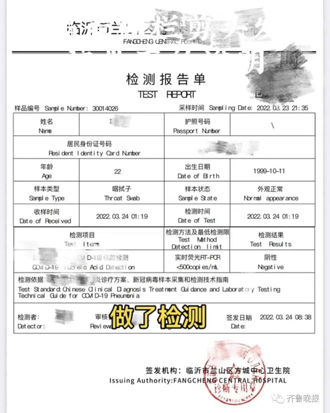 “当天晚上做了核酸检测显示阴性”