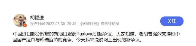 胡锡进:紧急进口辉瑞药物无可厚非