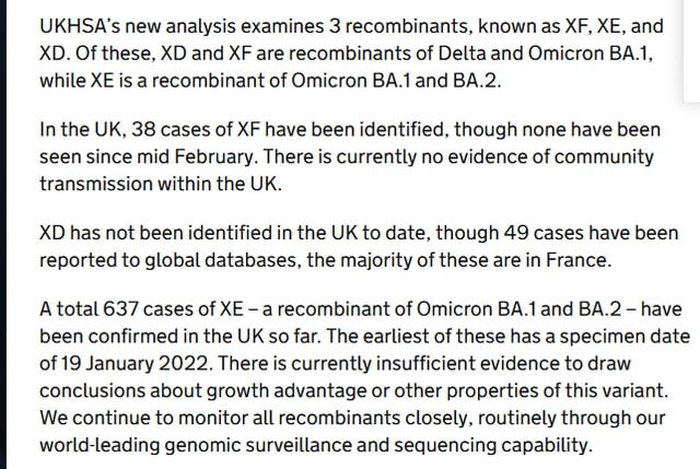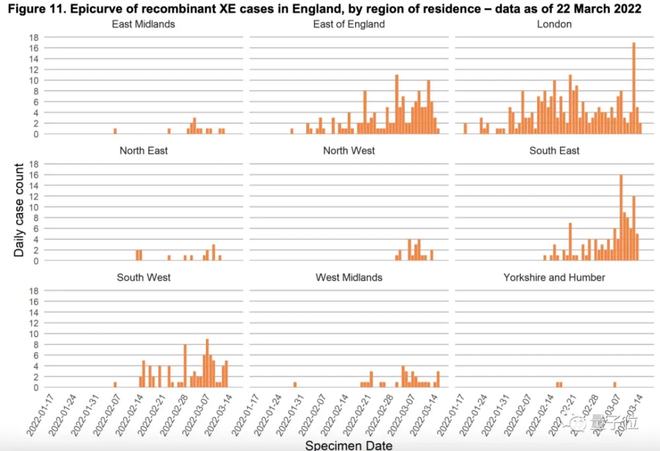 简报还显示,除XE变体外,英国卫生安全局还密切关注XF和XD变体。XF和XD变体都是Delta和BA.1的重组体(包括法国Delta和BA.1的重组体,XF是英国Delta和BA.1的重组体)。