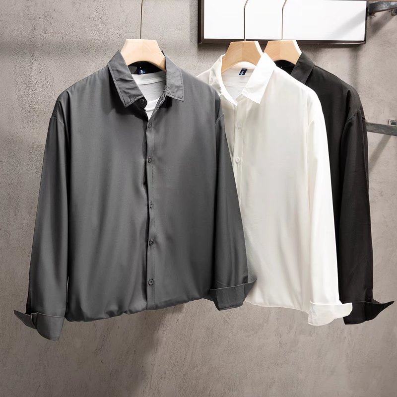 春秋必备休闲衬衫,冰丝面料,冰凉透气不闷热,黑白灰三色可选,面料顺垂不易皱,宽松百搭!